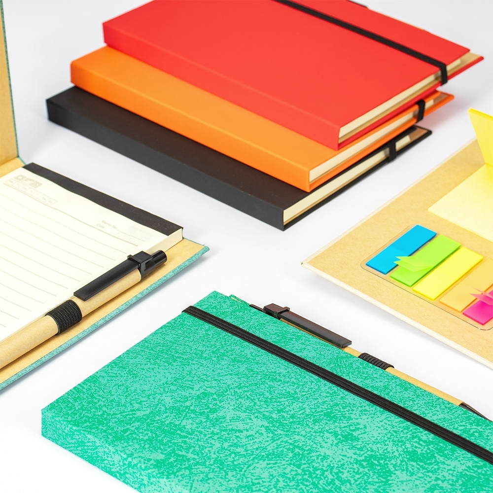 Um bloco de anotações com capa revestida em papel especial e fita elástica para fechamento.