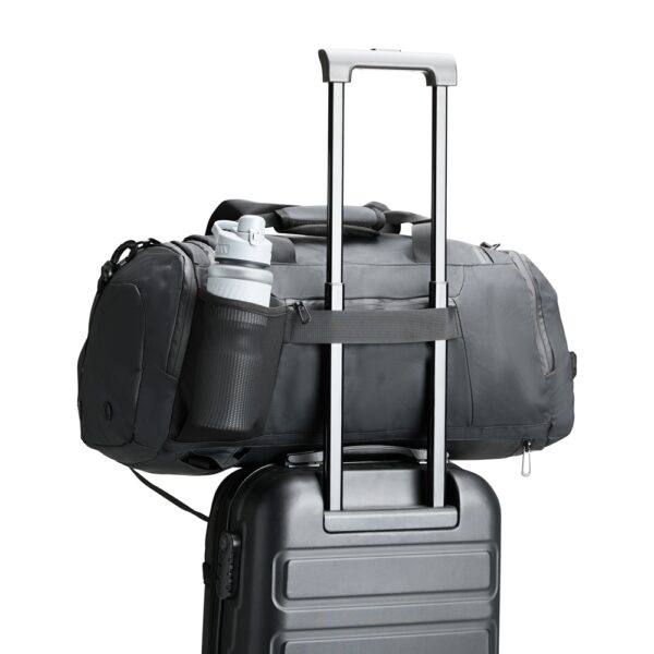 Apresenta alças de mão com suporte de juntura e um par de alças ocultas na parte inferior da bolsa, que permitem seu uso como mochila.