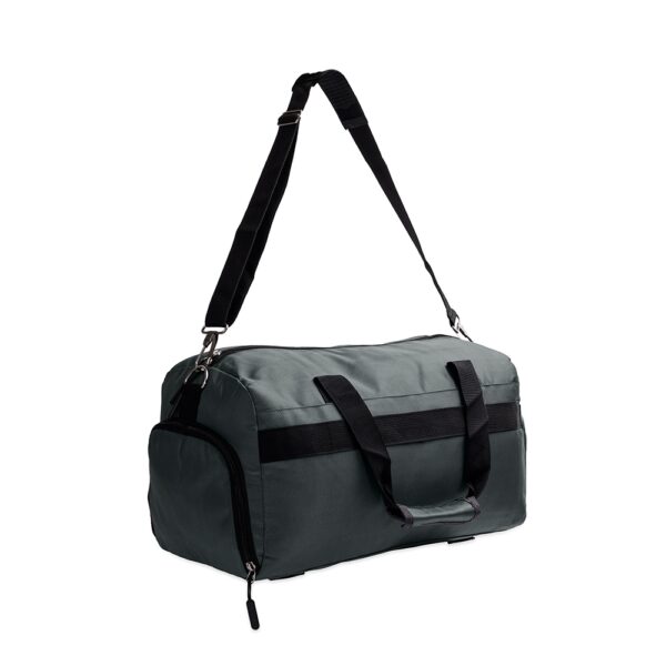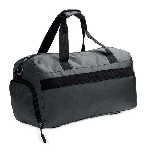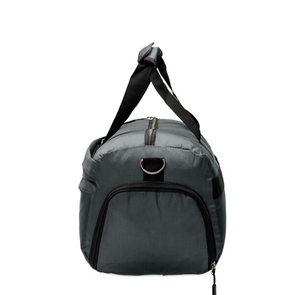Possui compartimento lateral para tênis, bolso frontal com revestimento em PVC para guardar itens úmidos e faixa posterior para acoplar em malas.