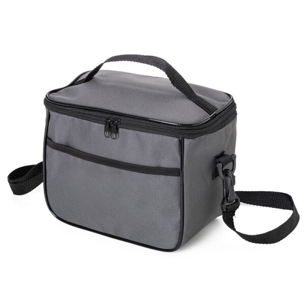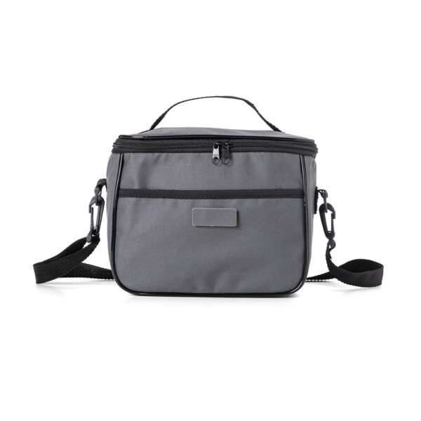 Bolsa térmica 6 litros com bolsos externos e alça de mão em nylon, contém bolso frontal aberto e bolso traseiro com zíper.