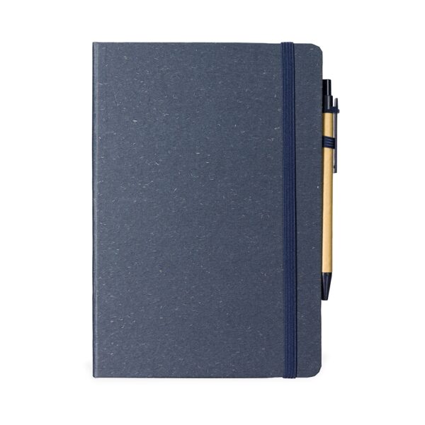 Acompanha uma caneta esferográfica de carga azul de 1,0mm com corpo em papelão e clip, acionamento por clique e ponteira em plástico.