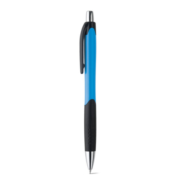Esferográfica em ABS com grip, acabamento brilhante e ponteira cromada.