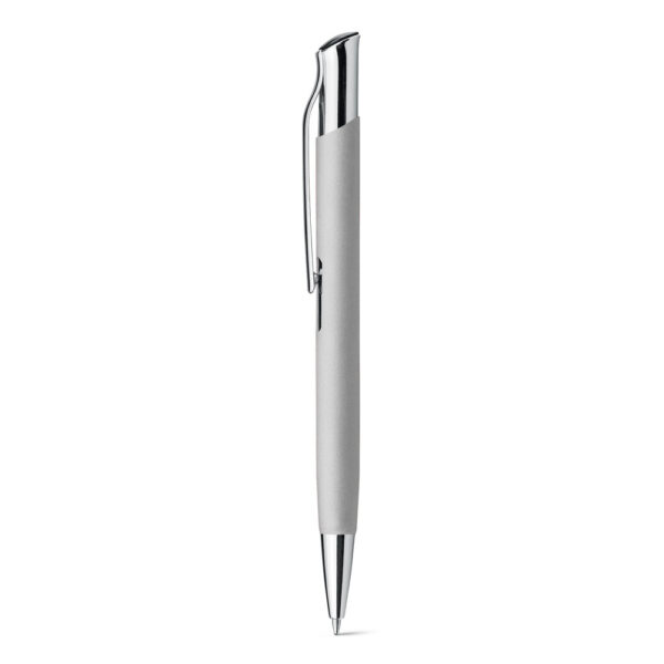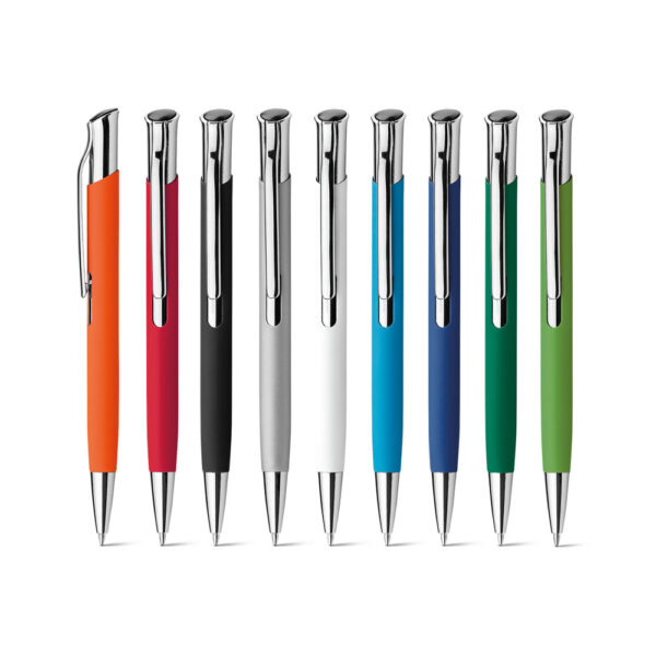 Esferográfica em alumínio com acabamento emborrachado e clipe de metal.