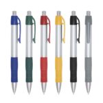 Caneta plástica prata com detalhes coloridos translúcidos.