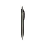 Caneta plástica com ponta, clip e pequenos detalhes em metal, além de detalhes ergonômicos na área próxima à tampa.