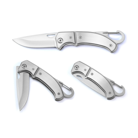 Canivete em aço inox e metal com fecho de segurança e clipe.