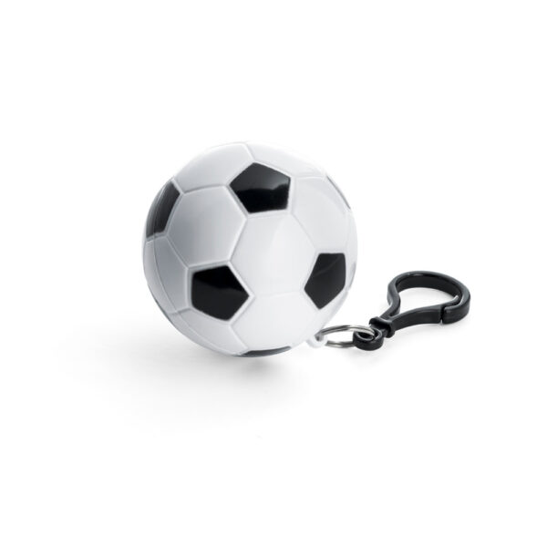Capa de chuva de tamanho único fornecida dentro de embalagem em formato de bola de futebol, com chaveiro e mosquetão.
