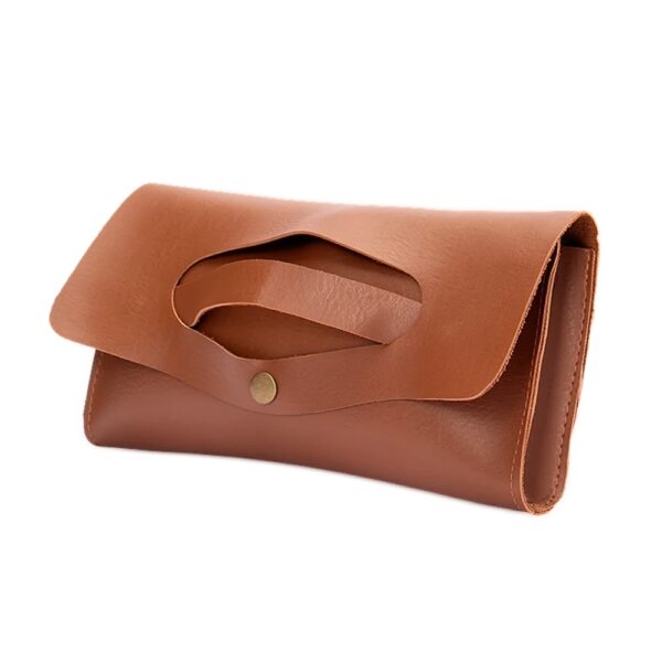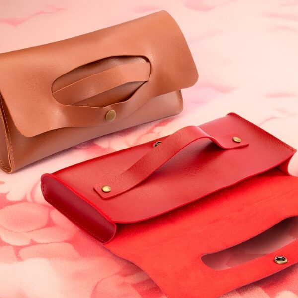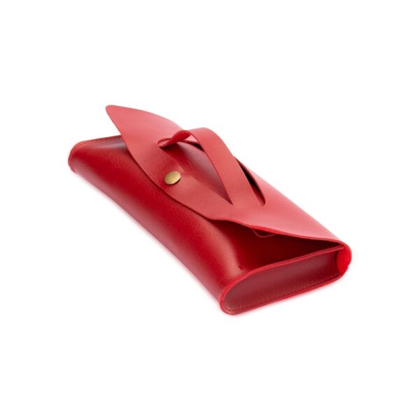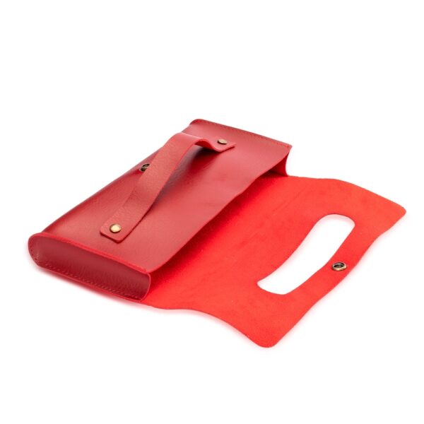 Confeccionada em couro sintético, possui revestimento interno com textura aveludada e fechamento por botão de pressão.