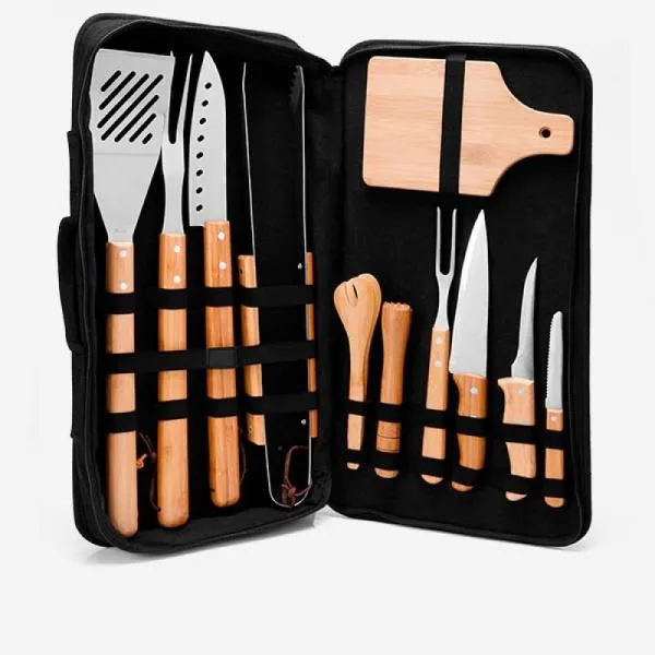 Composto por estojo em tecido preto com alça de mão e avental; tábua para churrasco, tábua para caipirinha, pegador e socador em bambu; faca 7”, faca para churrasco, pegador para churrasco, espátula para churrasco e garfo para churrasco em bambu/inox.