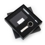 Kit executivo com 3 peças em estojo preto de papelão revestido com espuma interna.