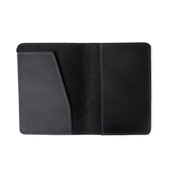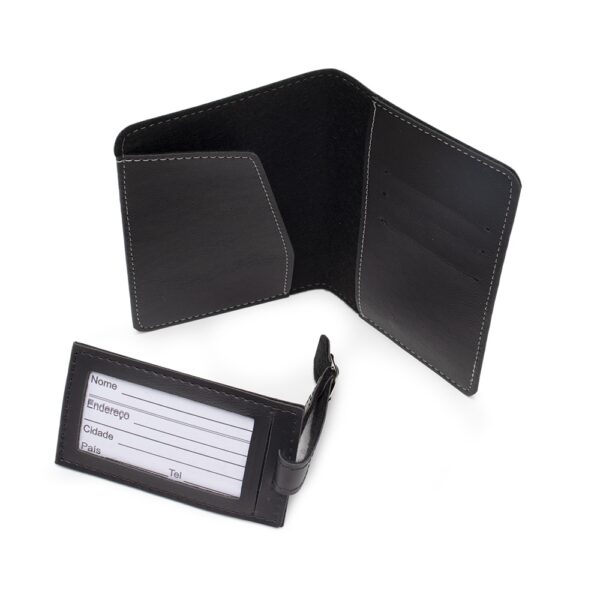 Possui porta passaporte com três divisórias para cartões e identificador de bagagem com fivela ajustável.