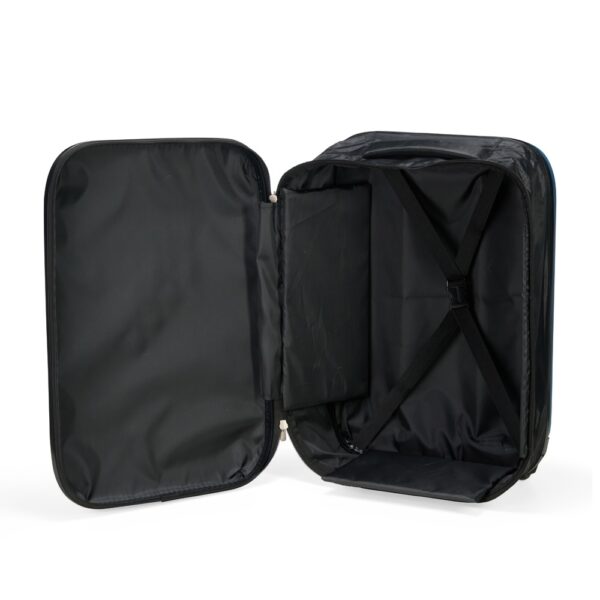 Conta com forro interno em poliéster 210D, cinta compressora para roupas e placas rígidas em PVC que mantêm a armação da mala quando desdobrada.