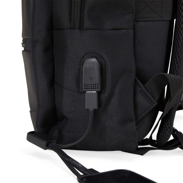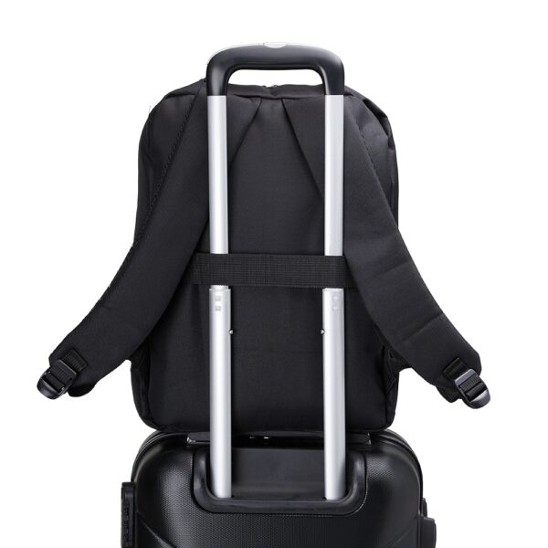 Com divisórias internas para acessórios, a mochila possui bolso lateral, suporte externo USB e alça para engate em malas de viagem.