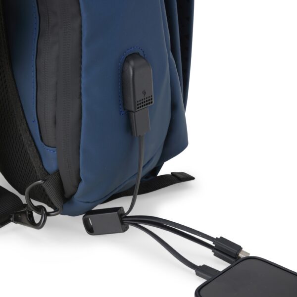A mochila contém dois bolsos para tablet, bolso lateral com zíper, divisórias internas para acessórios, alça ajustável, área costal com revestimento espumado e suporte externo USB.