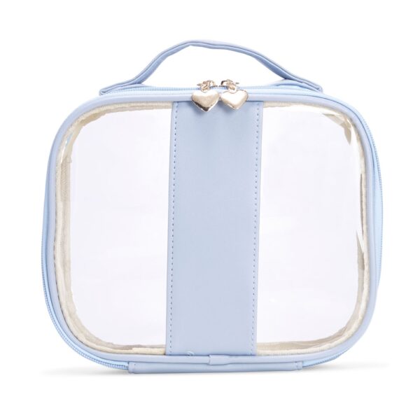Necessaire impermeável de PVC e PU tamanho G, parte interna com revestimento em tecido, possui alça superior para as mãos, e detalhe dourado em formato de coração no zíper.