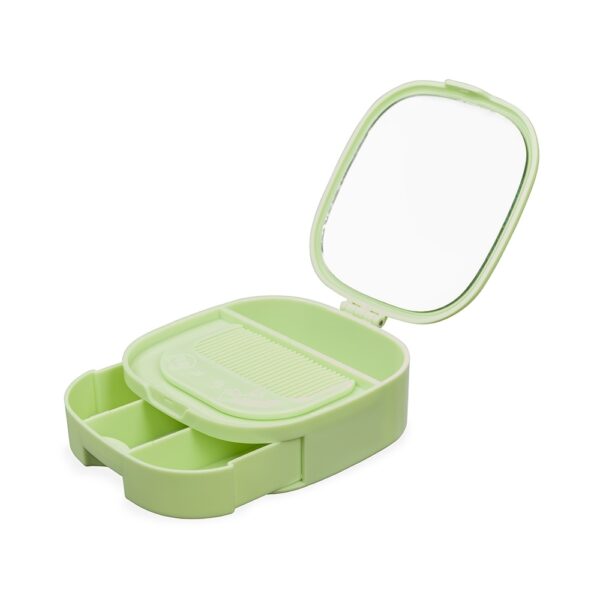Além disso, possui um espelho na parte interna da tampa, o que destaca sua versatilidade.