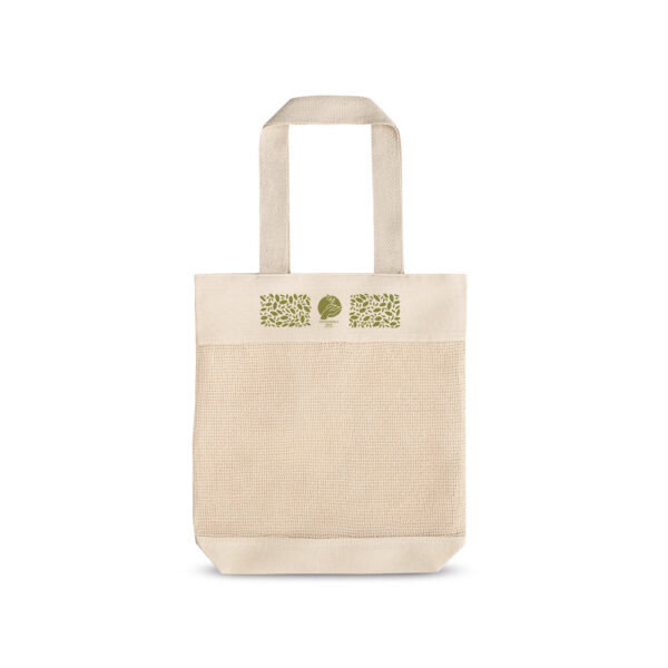 Sacola 100% algodão (180 g/m²) com malha 100% algodão na parte frontal.